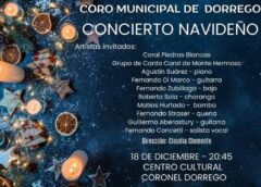 Cultura informó que el Coro Municipal de Coronel Dorrego presentará un Concierto Navideño. Será el 18 de diciembre a las 20:45 en el Centro Cultural. Son artistas invitados: Coral Piedras Blancas, Grupo de canto Coral de Monte Hermoso; Agustín Suárez, piano; Fernando Di Marco, guitarra; Fernando Zubillaga, bajo; Roberto Sola, charango; Matías Hurtado, bombo; Fernando Strasser, quena; Guillermo Aberastury, guitarra; Fernando Concetti, solista vocal.