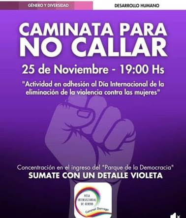 El área de Género y Diversidad, dependiente de la Dirección de Desarrollo Humano de la Municipalidad de Coronel Dorrego, invitó a participar de la actividad “Caminata para no callar”, organizada en el marco del Día Internacional de la Eliminación de la Violencia contra las Mujeres, que se conmemora cada 25 de noviembre. La propuesta, impulsada por la Mesa Intersectorial de Género, se desarrollará el venidero martes 25 a partir de las 19, con punto de encuentro en el ingreso al Parque de la Democracia, desde donde se iniciará…