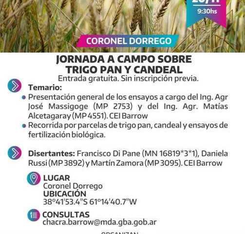 Producción de la comuna informó que junto al INTA realizarán una Jornada a Campo sobre trigo pan y candeal con entrada gratuita y sin inscripción previa, este jueves 20 a las 9:30 en un campo ubicado a 9 kilómetros de la ciudad. Habrá una presentación general de los ensayos a cargo de los ingenieros José Massigoge y Matías Alcetagaray del CEI Barrow y una recorrida por parcelas de trigo pan, candeal y ensayos de fertilización biológica. Disertarán Francisco Pane, Daniela Russi y Martín Zamora del CEI Barrow.