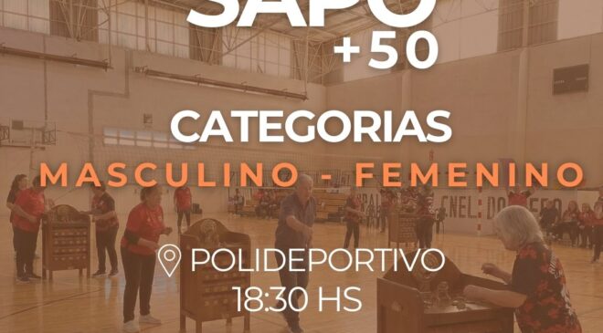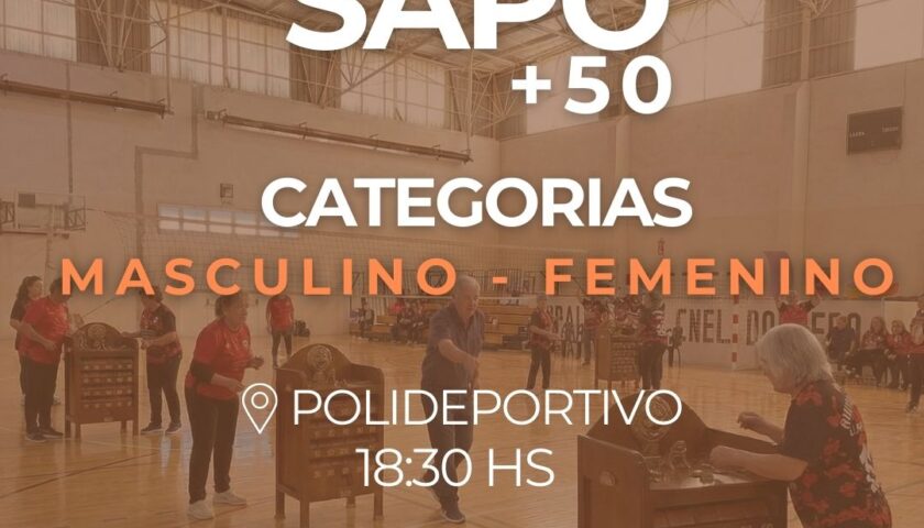 El próximo 12 de Febrero, a las 18.39 horas, en el Polideportivo municipal de Coronel Dorrego, serán llevara a cabo una torneo de sapo. Esta destinado a categorias femeninas y masculinas de mas de 50 años. La inscripción es libre y gratuita y a la finalizaron se entregaran medallas a el primer y segundo puesto de cada categoria