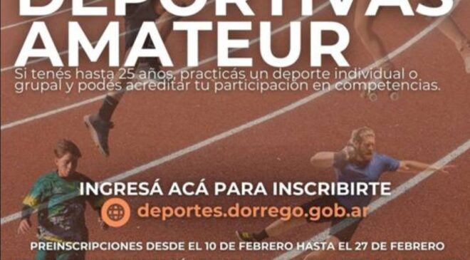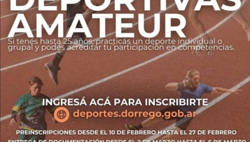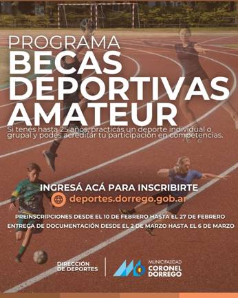 Desde hoy martes 10, deportistas amateurs del distrito pueden preinscribirse al Programa de Becas Deportivas. La preinscripción se realiza de manera online entre el 10 y el 27 de febrero, mientras que la entrega de la documentación requerida deberá efectuarse de forma presencial del 2 al 6 de marzo, conforme a las bases del programa. El Programa de Becas Deportivas Amateur es impulsado por la Dirección de Deportes del Municipio de Coronel Dorrego.