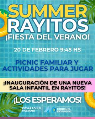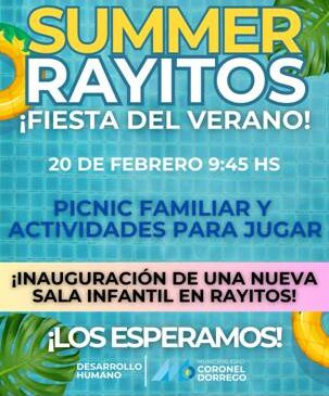 El director de Desarrollo Humano de la Municipalidad, Luciano Ripoll, invitó para mañana viernes 20 a las 9:45 a la realización de cierre de temporada de verano en la Casa Materno Infantil Rayitos; habrá un pinic familiar y juegos compartidos. Ripoll subrayó que en la ocasión se inaugurará una nueva sala en el establecimiento que posibilitará un trabajo más organizado atendiendo las necesidades por la edad y la correspondencia de las propuestas pedagógicas en las mismas.