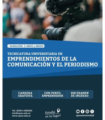 Cultura de la comuna informó que hasta mañana viernes 20 de febrero continúa abierta la Inscripción online en el Link: www.upso.edu.ar/ingreso/ Oferta Académica presencial para la Tecnicatura Universitaria en Emprendimientos de la Comunicación y el Periodismo Para recabar más información hay que ingresar en: https://www.upso.edu.ar/tecnicatura-universitaria-en. Cualquier duda, inconveniente en la carga de documentación, se puede consultar en la Sede UPSO en Yrigoyen 827 de 13 a 19 ó al teléfono 2921- 400802