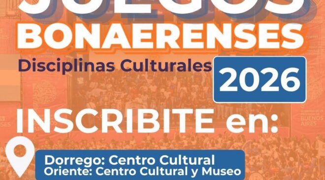 La Dirección de Cultura informó que está abierta la inscripción para participar en Juegos Bonaerenses 2026; se puede formalizar en los Centros Culturales de Coronel Dorrego y Oriente; las planillas de Salud se pueden conseguir en Coronel Dorrego, en Garabatos, Centro del Fotocopiado, Arcoiris y Mauro Pérez y en Oriente en Biblioteca Popular y Librería Etcétera. Las disciplinas para Personas con Discapacidad son: Artes Plásticas, Danza, Teatro, Danzas Folclóricas, Fotografía, Malambo, Narración Oral, Solista Vocal; para Adultos Mayores: Artes Plásticas, Cocineros Bonaerenses, Danzas Folclóricas, Danza, Tango, Fotografía y Literatura; para Juveniles: Arte Circense, Artes Plásticas,…