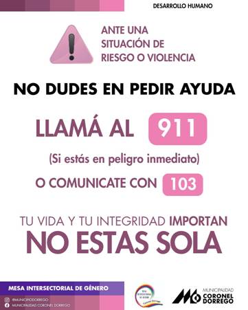 Información de interés del area de desarrollo humano de la municipalidad de Coronel Dorrego julio 10, 2025julio 10, 2025 puntointermedio COMPARTA NUESTRAS NOTICIAS Desde Desarrollo Humano de la comuna y la Mesa Intersectorial de Género informaron dónde comunicarse ante una situación de riesgo o violencia.