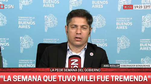 Kicillof habló en el programa El Diario (C5N) y se refirió con ironía a “la semanita” que tuvo Milei. Mencionó la negativa de los gobernadores provinciales a participar del festejo oficial del 9 de Julio en Tucumán y “la excusa” que puso el Presidente para no viajar por cuestiones climáticas. “Milei que no viajó por el clima, (Victoria) Villarruel viajando para dejarlo en ridículo, la negativa de los Gobernadores, hubiera tenido una foto muy penosa, muy triste, que no la quiso tener”, señaló el mandatario provincial.