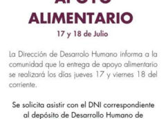 La Dirección de Desarrollo Humano informó que la entrega de apoyo alimentario se realizará jueves 17 y viernes 18 de julio. Solicitó asistir con DNI al depósito del área de 8 a 13.