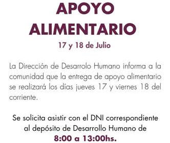 Entrega de Apoyo Alimentario en Coronel Dorrego julio 14, 2025julio 14, 2025 puntointermedio COMPARTA NUESTRAS NOTICIAS La Dirección de Desarrollo Humano informó que la entrega de apoyo alimentario se realizará jueves 17 y viernes 18 de julio. Solicitó asistir con DNI al depósito del área de 8 a 13.