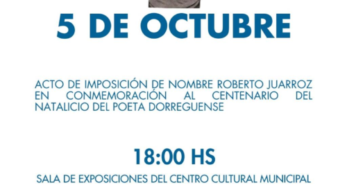 La Municipalidad y el CIIE cursaron la invitación para asistir el venidero domingo 5 de octubre a las 18 al Centro Cultural al Acto de Imposición de nombre de Roberto Juarroz a la Sala de Exposiciones del lugar; es en conmemoración al centenario del natalicio del poeta dorreguense.