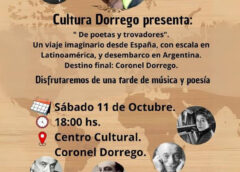 Cultura de la comuna anunció para este sábado 11 desde las 18 en el Centro Cultural «De poetas y trovadores», un viaje imaginario desde España, con escala en Latinoamérica y desembarco en Argentina, destino final: Coronel Dorrego. Será una tarde música y poesía, tal se anunció.