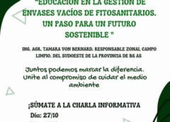 La Dirección de Producción y Turismo de la Municipalidad informó que la Fundación Campo Limpio brindará una charla informativa sobre «Educación en la Gestión de Envases Vacíos de Fitosanitarios. Un paso para un Futuro Sostenible»; estará a cargo de la ingeniera Tamara Von Bernard, responsable zonal. Será en la Escuela Agraria el próximo lunes 27 a las 10. Estará abierta a todo público.