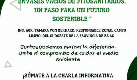La Dirección de Producción y Turismo de la Municipalidad informó que la Fundación Campo Limpio brindará una charla informativa sobre «Educación en la Gestión de Envases Vacíos de Fitosanitarios. Un paso para un Futuro Sostenible»; estará a cargo de la ingeniera Tamara Von Bernard, responsable zonal. Será en la Escuela Agraria hoy lunes 27 a las 10. Estará abierta a todo público.